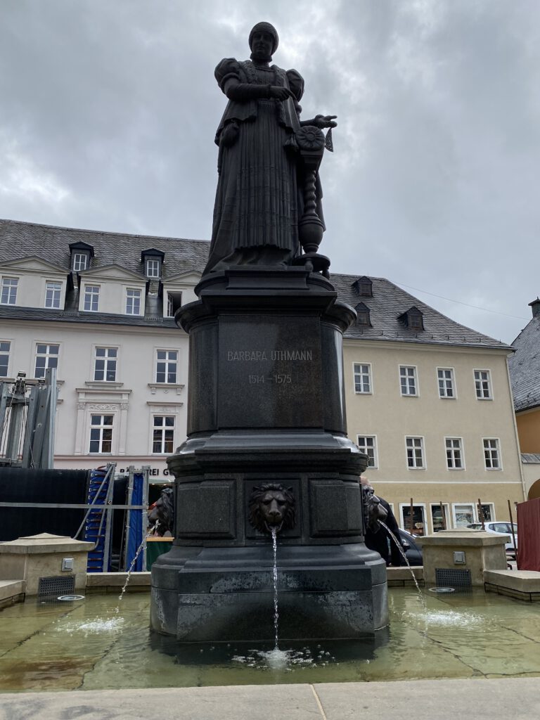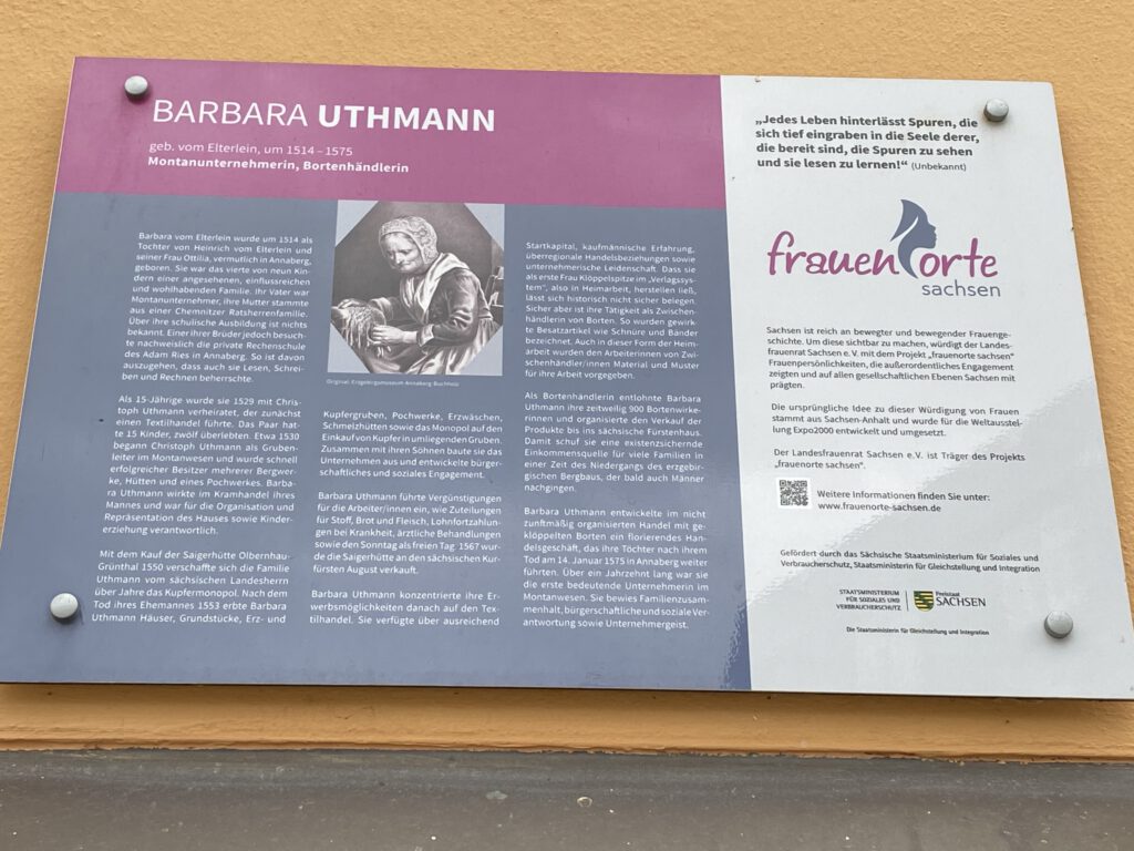 Auf der Rückfahrt nach Dresden wurde kurz Station gemacht an zwei unserer Frauenorte: Annaberg-Buchholz mit Barbara Uthmann und Crottendorf mit Freya Graupner.