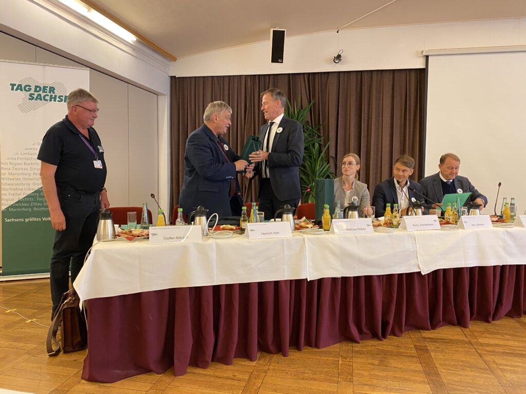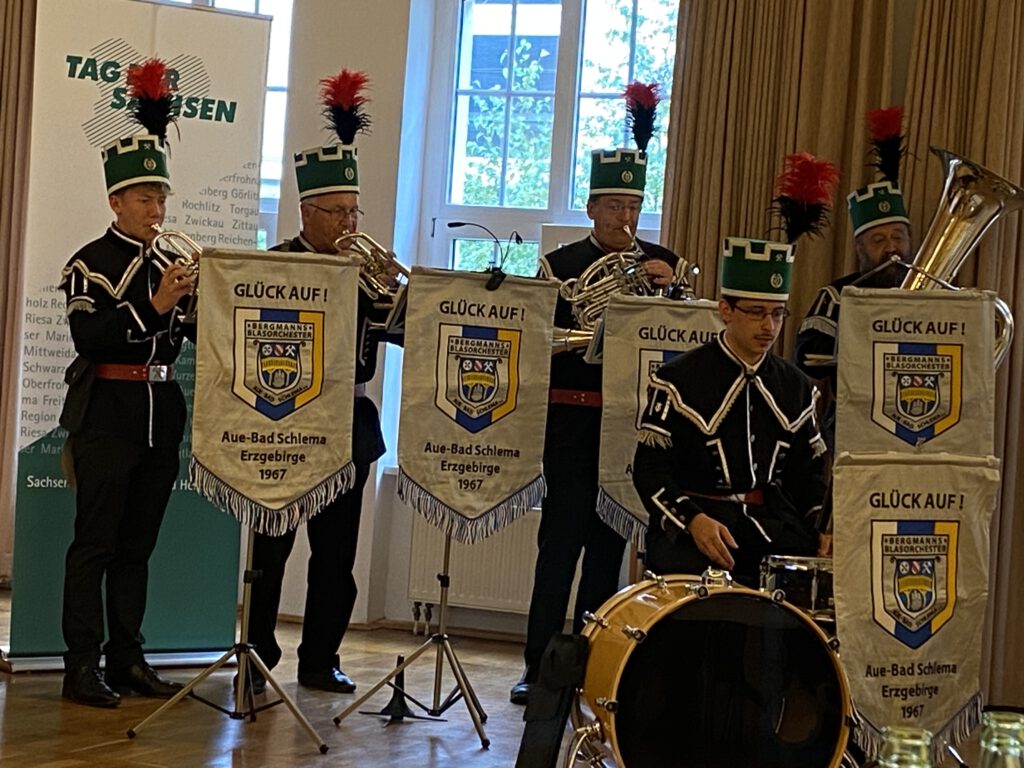 Vom 1. bis zum 3. September 2023 fand in Aue-Bad Schlema der 29. „Tag der Sachsen“ statt. Da der Landesfrauenrat Sachsen e.V. sowohl Mitglied im Präsidium als auch im Kuratorium „Tag der Sachsen“ ist, waren wir zur Festsitzung am 2. September im Kulturhaus „Aktivist“ in Bad Schlema vor Ort. Mit dabei war das *Bergmanns* Blasorchester Bad Schlema und gemeinsam wurde das Steigerlied „geschmettert“. Auf zwei Bildern sieht man auch noch ehemalige Grubenbahnen aus den Gruben in Bad Schlema.