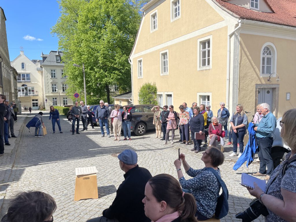 Die Tafeleinweihung wurde zum Anlass genommen, die Vergangenheit, Gegenwart und Zukunft des Schwesternhaus Ensembles näher zu beleuchten. So vermittelte eine Führung durch das Schwesternhaus den Gästen einen Eindruck vom aktuellen Zustand des Gebäudes. Die anschließende Tafeleinweihung widmete sich der Historie dieses Wohnkomplexes sowie den Schicksalen der Frauen und Mädchen, die dort gelebt und gewirkt haben. Im Anschluss wechselte die Veranstaltung in die Villa Anna. Dort stellte der Dezentrale Sachsen e.V. das gemeinschafltiche Wohnprojekt „Wieder gemeinsam Wohnen in der Villa Anna?“ vor. In Gesprächen mit dem Zentrum für Baukultur Sachsen und dem Eigentümer wurde darüber diskutiert, wie in Zukunft neues Wohnen entstehen kann. Die ganze Geschichte des Schwesternhauses lesen auf dem Tafeltext unter www.frauenorte-sachsen.de.