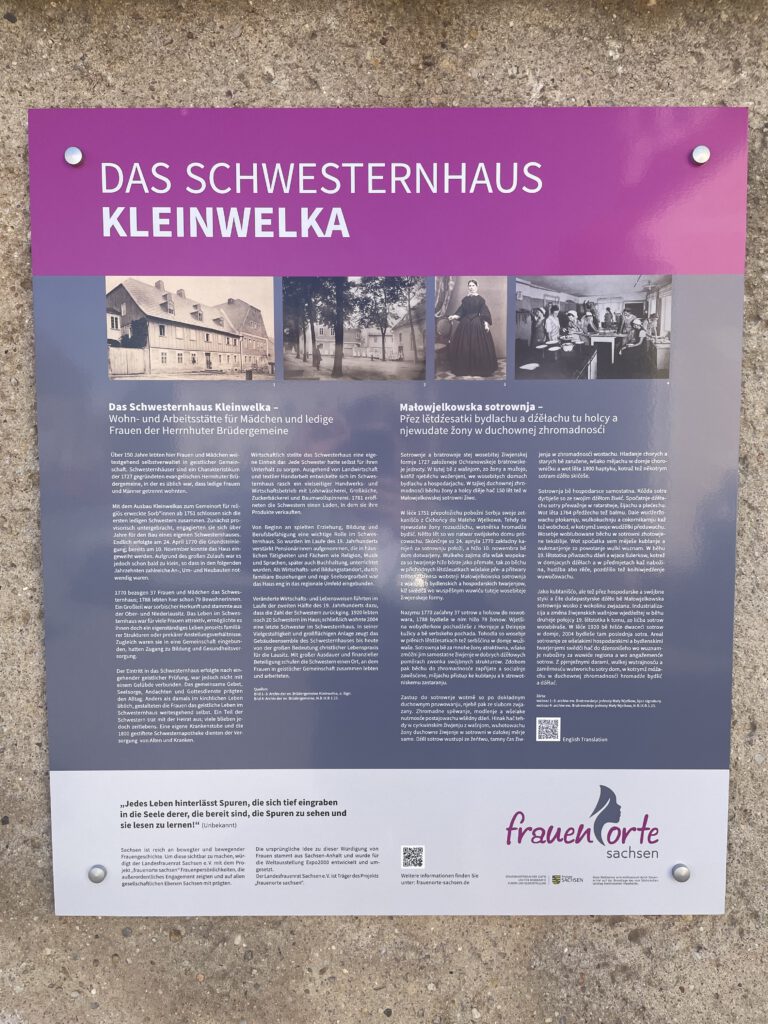Unser erster Frauenort 2024 wurde am 27. April 2024 feierlich eingeweiht. Mit unserer 38. Frauenorte-Tafel würdigen wir das Schwesternhaus Ensemble in Kleinwelka, welches eine Wohn- und Arbeitsstätte für Mädchen und ledige Frauen der Herrnhuter Brüdergemeine war.