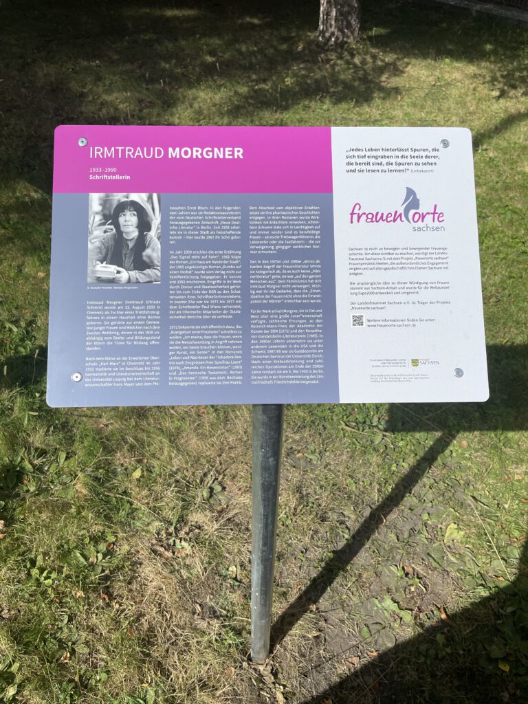 Am 22. August 2023 – dem 90. Geburtstag der Schriftstellerin Irmtraud Morgner – wurde ihr zu Ehren eine Gedenktafel in Chemnitz eingeweiht. Die Tafel findet sich ab sofort am Haupteingang des Georgius-Agricola-Gymnasiums (Adresse: Park der Opfer des Faschismus 2 in 09111 Chemnitz), welches früher die Karl-Marx-Oberschule und Morgners Lernort war.