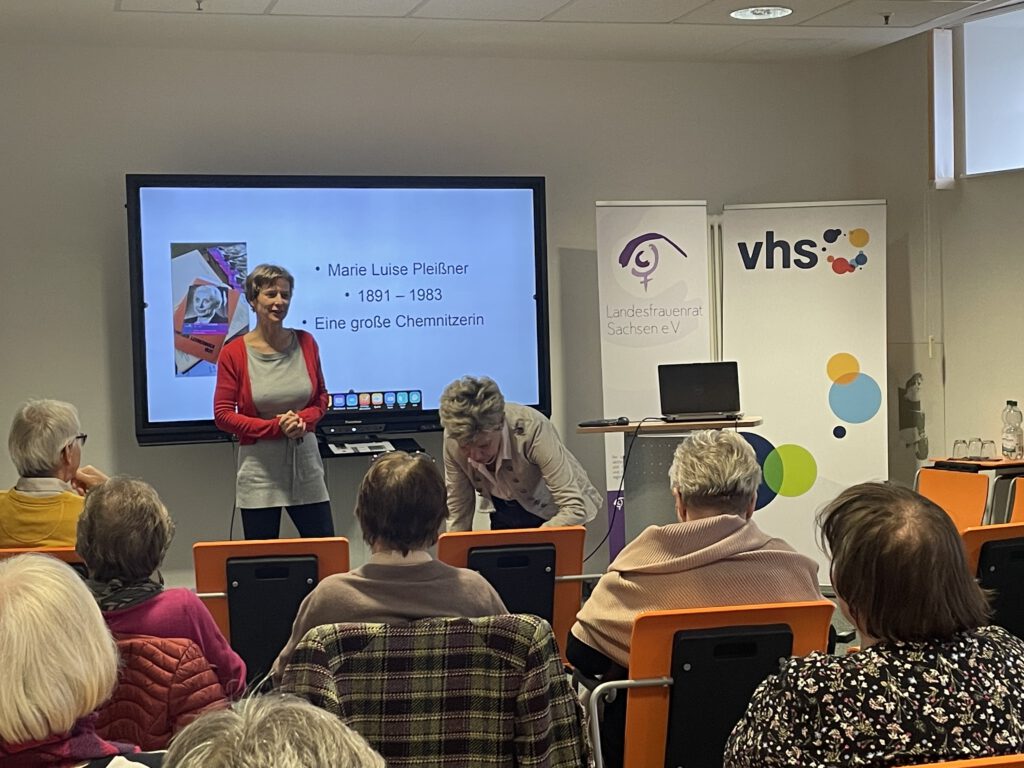 Eingeladen waren drei Expert*innen, die die drei Chemnitzer Frauen(-orte) zu Marie Luise Pleißner, Minna Simon und Marianne Brandt biografisch und im Kontext ihrer Zeit vorstellten. Den Einstieg machte Regina Doerffel vom Chemnitzer Geschichtsverein e.V. mit Ihrem Beitrag zu Marie Luise Pleißner (1891-1983). Sie stellte Marie Luise Pleißner als eine facettenreiche Persönlichkeit vor: als Lehrerin, als Friedensaktivistin, als Frauenrechtlerin, als Humanistin, etc.