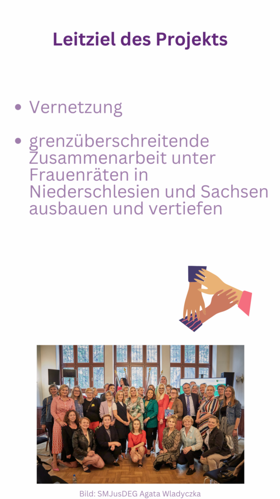Po udanym rozpoczęciu naszego pierwszego projektu tworzenia sieci i współpracy międzyregionalnej z województwem dolnośląskim w 2022 r., Landesfrauenrat Sachsen e.V. chciałby skonsolidować tę pracę i pójść nowymi drogami w oparciu o dotychczasowe osiągnięcia. Głównym celem projektu jest rozszerzenie i pogłębienie sieci kontaktów i współpracy transgranicznej, która wciąż jest w powijakach wśród rad kobiet na Dolnym Śląsku i w Saksonii.